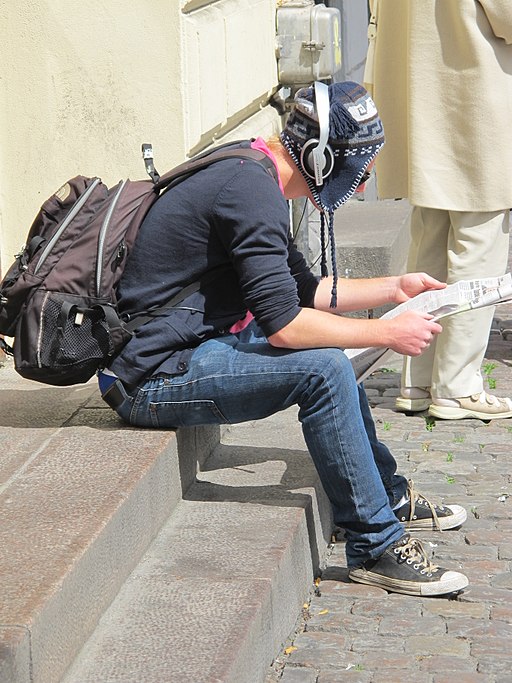 student reading newspaper and listening to music with headphones