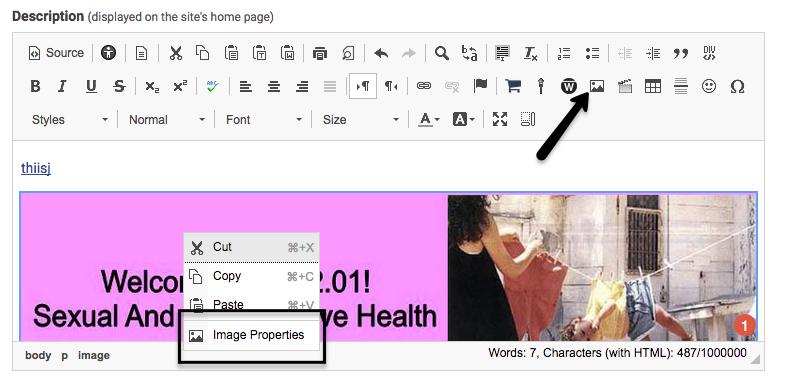 To add an image into many applications, look for the insert picture icon in the editor box. Some applications will let you drag and drop images directly into the document. Others have a separate upload media button or insert picture command, such as WordPress or PowerPoint. If you need to resize the image, usually you can right click on it and find the Image Properties or locate an pencil icon to edit. It is often also possible to click on the corner of an image, then hold down your mouse to resize manually. This image illustrates how the insert picture icon and Image Properties appear in the Sakai editor box.
