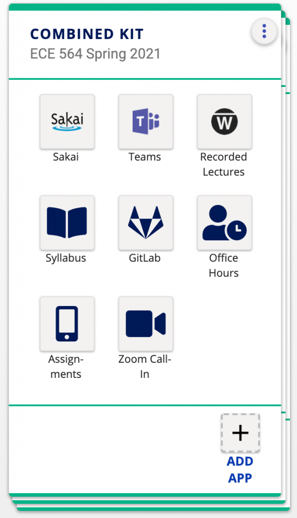 This semester, Telford’s kit for ECE 564 contained eight apps: Sakai, Teams, Warpwire, Syllabus, GitLab, Office Hours, Assignments, and Zoom. Instead of linking to various apps from his course Sakai site (a common practice for instructors at Duke), Telford uses Kits as the landing page for his students. From the Kits website, students can access any app simply by clicking on the appropriate tile. I asked Telford why he prefers the tiled layout of Kits compared to the nested structure of a Sakai site. He explained that the Kits layout is more natural and intuitive than Sakai because he doesn’t have to “nest” apps that are not genuinely nested. For example, GitLab and Sakai are two very different apps, and by placing them next to one another in a kit, the natural “peer” relationship between the two apps is explicit. To the contrary, placing a link to GitLab in the course Sakai site would imply a “nested” relationship that is in fact contrived. Telford described how each of the apps in his kit benefits his students: