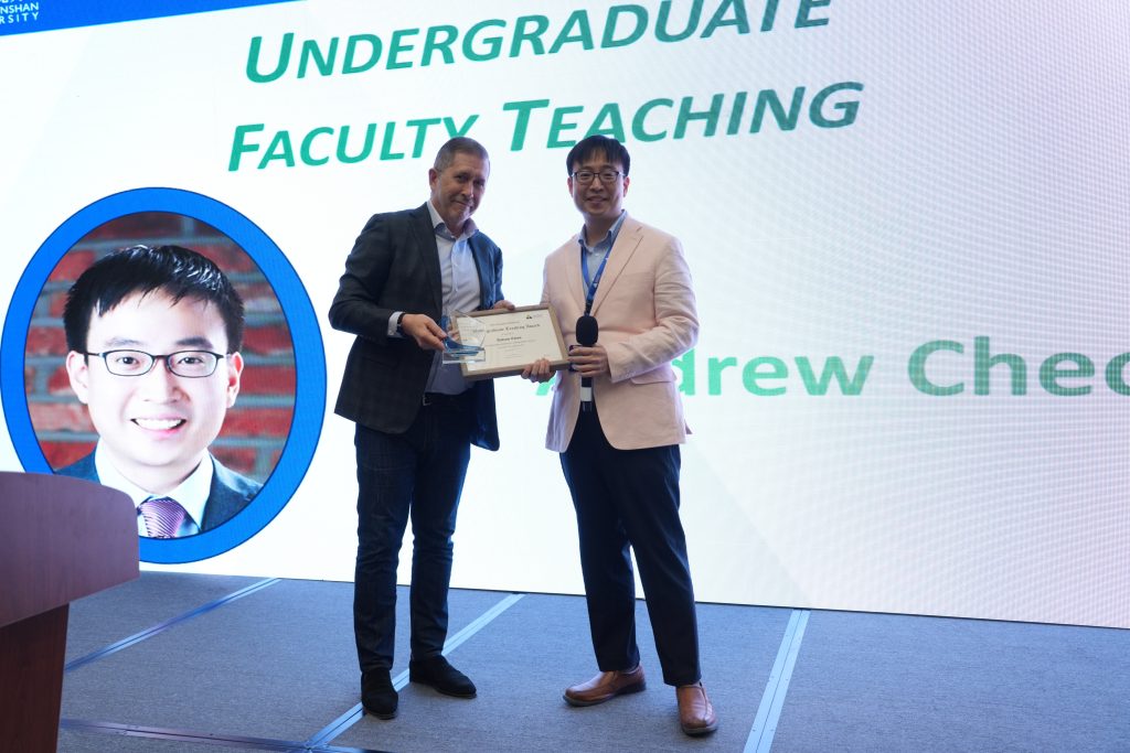 Dr. Cheon receiving the 2025 DKU Undergrad Teaching Award from Dr. Scott MacEachern ( Photo by Jietong Zhou)
