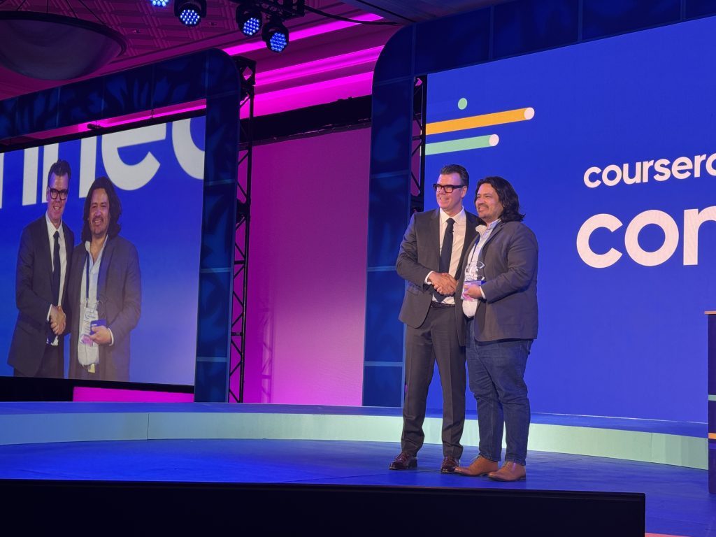 Duke University has been awarded Coursera’s prestigious Vision and Values Award, recognizing the university’s leadership in principled innovation, thoughtful experimentation, and deep commitment to learners. Quentin Ruiz-Esparza, Director for Digital Product Strategy and Design at Duke Learning Innovation & Lifetime Education (LILE), accepted the award on behalf of Duke at the Coursera Connect Awards Banquet on September 9.